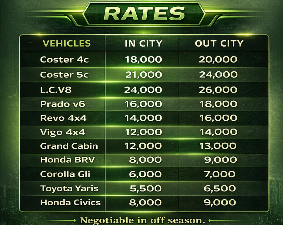 Browse our fleet including Corolla, Prado, Land Cruiser, Hiace, and Coaster buses, or choose your preferred travel destination.